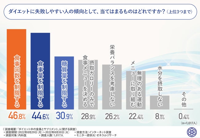「ダイエットに失敗しやすい人の傾向として、当てはまるものはどれですか?(上位3つまで)」と質問したところ、『食事回数を制限する(46.8%)』と回答…