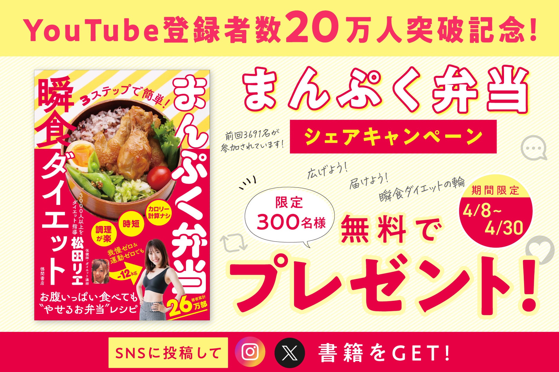 YouTube登録者数20万人突破記念!瞬食シリーズ累計38万部の「まんぷく弁当瞬食ダイエット」SNSシェアキャンペーンを4月8日より開始!